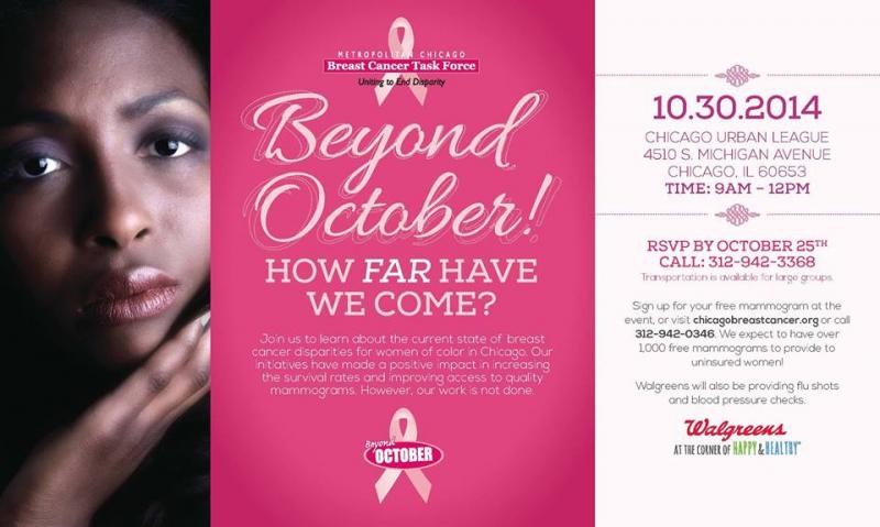 On October 30th, 2014, the Task Force will present a report back to community at the Chicago Urban League. Attendees will learn about the state of breast cancer disparities in Chicago. This event shall underscore the significance of the Task Force's ongoing projects and the need for all individuals to continue raising awareness of health disparities during the months beyond October. If you are interested in attending this event, please register by calling (312) 942-3368.