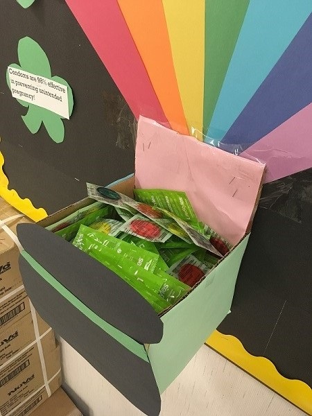 Turns out, these students think sex is funny. And, to be totally honest, I think sex is kind of funny. Meeting the students half way is absolutely essential. This means acknowledging the humor in unrolling a condom over a wooden penis-shaped demonstration tool in front of a class of 50 15-year-olds. This means referencing song lyrics they know when referring to a serious topic like rape culture. This means making a bulletin board with a pot of condoms at the end of a rainbow.