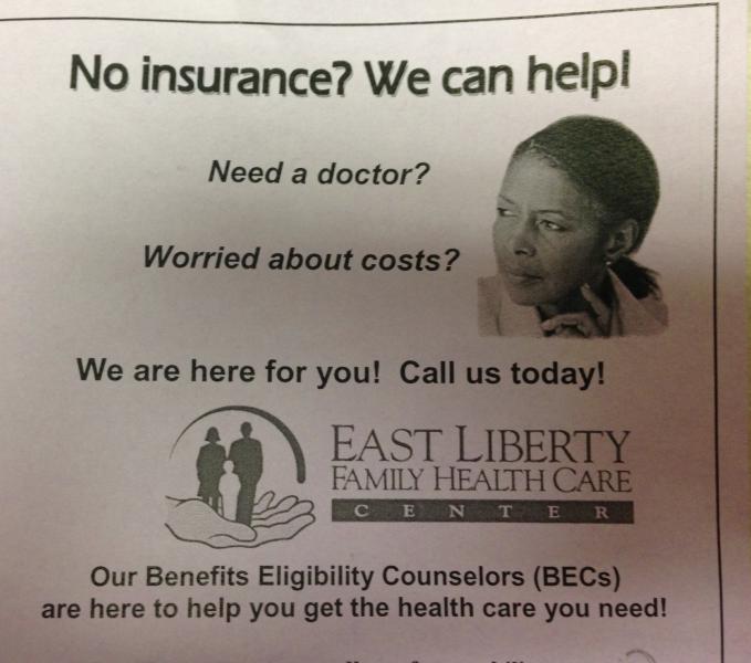 A pamphlet advertises the services offered at East Liberty Family Health Care Center to help patients enroll in insurance.