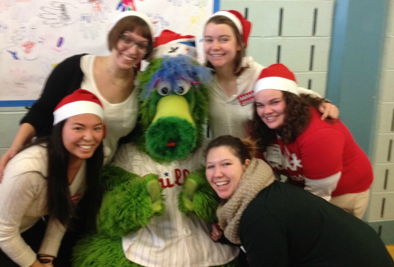 In the spirit of giving, Philadelphia Health Corps chose the 20th Annual Rubye’s Kids Holiday Party as their December group service project. Our members met bright and early at Girard College to put the finishing touches on decorations and setup the many, many activities the children would see while waiting for their turn in Toyland and their visit with Santa. Volunteers at the event staffed fun activities like face-painting and temporary tattoos; and gave out much needed school supplies, hats and gloves. The bravest of the volunteers took on the important role of chaperoning a group of 5 children throughout the day. Chaperones were tasked with making sure each child got to visit the 15 activity stations and if possible, squeeze in a dance with Spiderman, Spongebob, and the Phillie Phanatic.