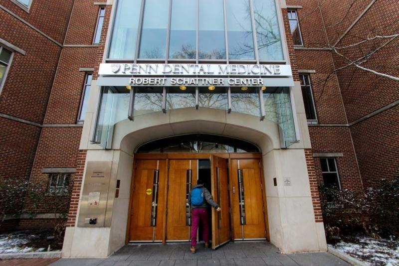 Image Description: Entrance of Penn Dental Medicine, person entering through front doors.