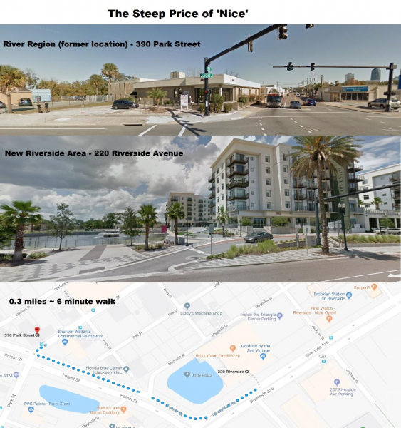 When the lease to the River Region Human Services building ended, the faculty were not allowed to renew the lease in the up-and-coming Riverside area. As seen in the picture to the right, the old building on Park Street is a short walk away from the new and expanding Riverside developments. The companies, businesses, and apartment complexes in this area did not want a methadone clinic in the now upscale neighborhood. They undoubtedly wanted to attract the middle class and make the area appear “nicer.” However, the methodology is extremely short-sighted, as now clients who live in Health Zone 1 will no longer have easy access to treatment for addiction and mental health conditions. The new location is now south of the St. John’s river in an area that is relatively isolated from Health Zone 1, public transportation stops, and many patients who need treatment. This could have detrimental effects on the health of the community, and add yet another huge barrier to healthcare access in the most needy of populations.