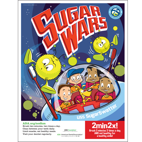 This year’s Dental Health Month theme is “Sugar Wars,” which focuses on the direct effect a child’s diet can have on their teeth. The slogan reads, “Brush two minutes, two times a day. Clean between your teeth daily. Limit snacks, eat healthy meals. Visit your dentist regularly.” Children often times are tempted to eat high sugar foods, which can have a detrimental effect on their teeth. A common misconception parents have about their children is that since baby teeth will eventually fall out, there is no cause for concern to keep these teeth as healthy as possible. This is not the best practice for a child’s dental health.